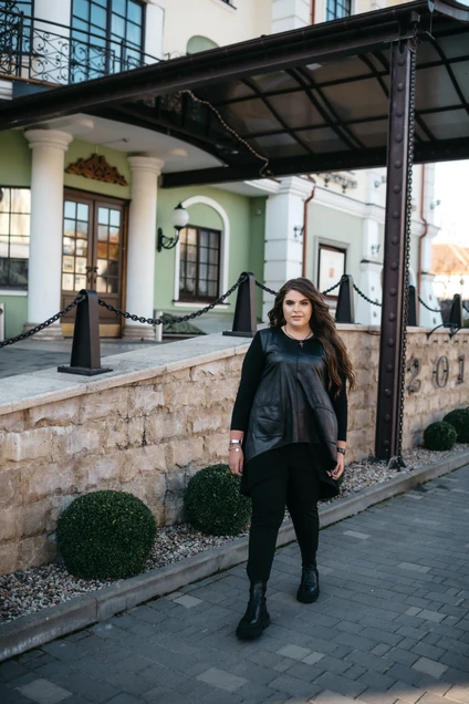 Туника женская прямая, расширенная к низу.Рукав втачной. Функциональные карманы. Разноуровневая линия низа и двухслойность этого изделия (с низу эластичное трикотажное полотно, верхняя часть из эластичного материала, имитирующего кожу) позволяет использовать его как платье - тунику в комплекте с легинцами и ботфортами. Так же можно комбинировать с любыми брюками. Длина изделия 71 см полочка, 103 см спинка, длина рукава 59 см.