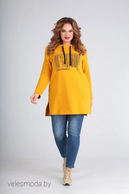 Туника удлиненная, прямого силуэта, рукав втачной, длинный,разноуровневая линия низа с разрезом по боковым швам. Изделие изготовлено из мягкого трикотажного эластичного полотна, с изнаночной стороны - шелковистый теплый ворс. Полочка туники декорирована стильной печатью. Узкий воротник - стойка со втянутым мягким контрастным шнурком. В боковых швах функциональные карманы. Длина изделия 83 см, длина рукава 60 см.
