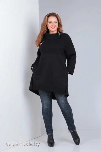 Туника женская удлиненная, выполнена из нескольких видов трикотажных эластичных полотен. Рукав втачной, длинный. В боковых швах функциональные карманы. Воротник декорирован молнией. Линия низа разноуровневая. Верхняя часть туники и рукав из мягкой теплой ткани - ангоры. Длина изделия 82/90 см, длина рукава 61 см.