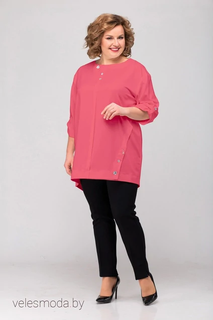 Интересный блузон прямого покроя длиной ниже линии бедер. Линия плеча спущена, рукав слегка заужен к низу, длиной 3/4 с регулировкой в виде паты и пуговицы. Спинка имеет интересную асимметрию по низу. Изделие декорировано красивыми пуговицами. Свободный, легкий силуэт, изящные линии подрезов, отделочная деталь по горловине создают романтическое настроение вашему образу!