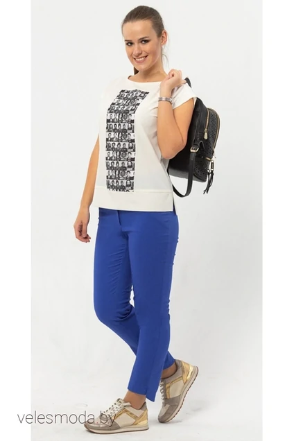 уника женская прямого силуэта с коротким цельновыкроенным рукавом, овальной горловиной, отрезными нижними частями переда и спинки. Деталь переда с отрезной кокеткой и втачной деталью по центру переда. Спинка со средним швом. В боковых швах – разрезы. Отделкой в изделии является комбинирование ткани. Длина по спинке от верхней точки плечевого шва до линии низа - 64 см. Измерения даны для 44 размера.
