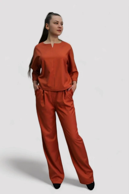 Туника женская из костюмной поливискозной ткани прямого силуэта с цельновыкроенным рукавом, длиной выше линии бедер. Горловина овальной формы с «V»-образным разрезом по центру переда. Перед и спинка со средним швом. Рукав широкий, длиной ¾, с притачной манжетой на отворот. В нижней левой части переда пришивное украшение.