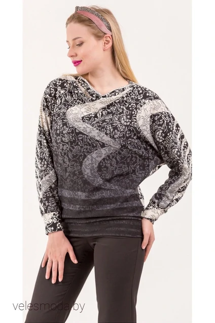 Туника женская прямого силуэта из трикотажного полотна с цельновыкроенным рукавом, длиной до линии бедер, с притачной манжетой по низу изделия и низу рукава. Линия горловины оформлена в виде «лодочки» с « качелями» по переду. Драпировка по горловине переда формируется за счет складок в плечевом шве.