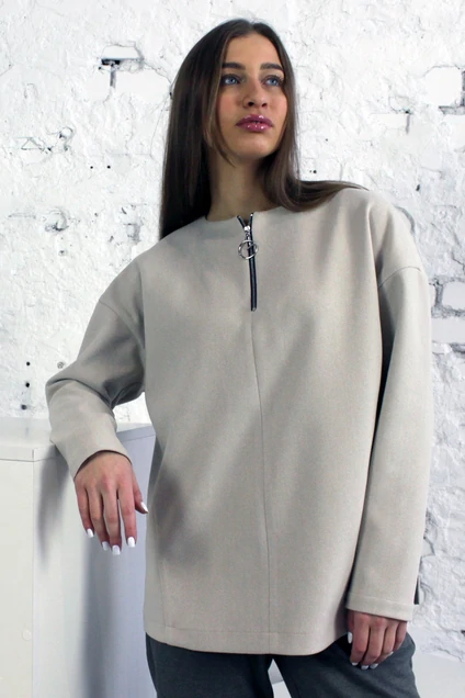 Полушерстяная трикотажная туника прямого силуэта длиной выше линии бёдер с овальной горловиной, застёжкой на молнию, средним швом и рельефами по переду. Отделкой является вставка из кожзам в боковых швах на уровне разрезов.