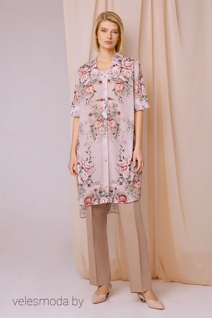 Легкая и свободная туника прямого силуэта с нежным цветочным принтом придаст Вашему образу романтичный оттенок. Блуза с воротником и разрезами, на переде обработаны нагрудные вытачки, рукав втачного покроя с разрезами. Застежка центральная на пуговицах.