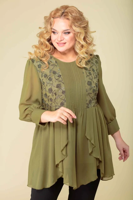 Туника женская нарядная, полуприлегающего силуэта, из шифона и гипюра. Горловина круглая, рукав 3/4 на манжете. Перед с подрезами и защипами по лифу. Из-под подрезов фигурная драпировка. Ни переда двухслойный. Спинка свободная с каплевидным разрезом на петлю и пуговицу. Изделие на подкладке.