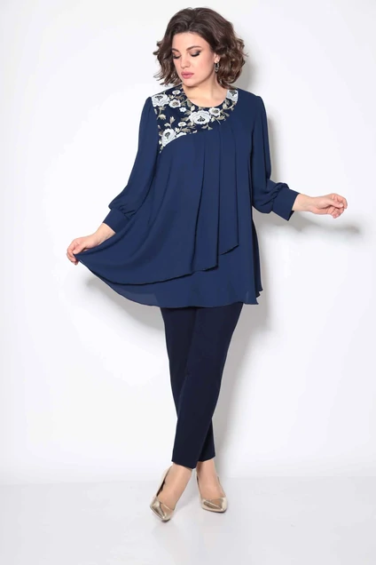 Туника женская свободного силуэта, из шифона и гипюра. Горловина округлая, рукав три четверти, расширенный к низу на манжет. Перед состоит из фигурной кокетке и двух ниспадающих деталей. Верхняя деталь ассиметричная со складками. Спинка с разрезом капелькой на пуговицу. Изделие на трикотажной подкладке.