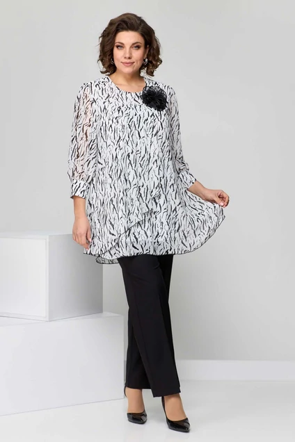 Туника женская нарядно-повседневная, свободного силуэта из летящей блузочной ткани. Горловина круглая, рукав три четверти, на манжету с пуговицами. Рукав расширен к низу на сборку. Перед с фигурной кокеткой, из-под кокетки асимметричная деталь переда со складками. Нижняя деталь переда с прямым низом, верхняя с диагональным срезом. Спинка свободная. К изделию прилагается декоративный съемный цветок.