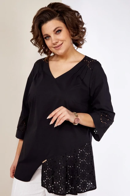 Туника прямого силуэта. V-образный вырез горловины. Рукав втачной 3/4 кокетки выполнены с ришилье по полочке и спинке защипы. Длина-73 см.