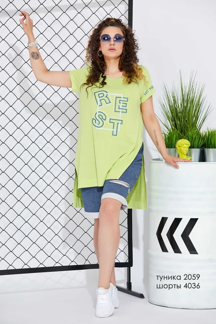 Туника из вискозного трикотажа, длиной чуть выше колена спереди и удлиненной спинкой. Изделие прямого силуэта, с разрезами по бокам и коротким рукавом. Перед и рукав декорирорван авторским принтом с глитерной термопленкой.