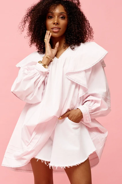 Туника женская из хлопкового полотна свободного кроя А образного силуэта. Рукав втачной объёмный по низу рукава широкий манжет. V образный вырез горловины. Платье украшено крупным воланом по груди переходящий на спинку. Горловина , рукав, низ изделия украшен кружевом. Длина изделия 64, длина рукава 65