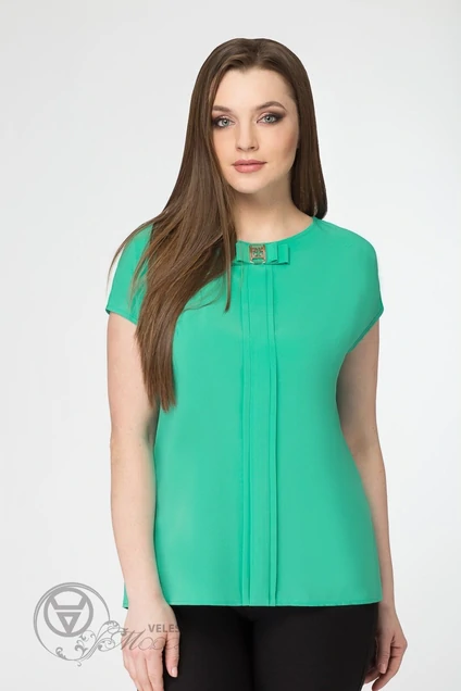 Туника женская свободного силуэта, со спущенным плечевым поясом. Перед с нагрудными вытачками, с втачной по центру планкой и застроченными складками по бокам от нее. Спинка со средним швом, с каплевидным разрезом и застежкой на одну воздушную петлю и пуговицу. Туника длиной на уровне линии бедер, с удлиненной спинкой. Отделкой туники служит декоративный бант и украшение для одежды. Длина туники 70-71,5 см Длина плеча 21-22 см
