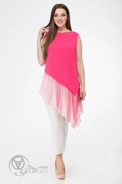 Туника женская свободного силуэта, с вырезом горловины типа «лодочка», с открытыми проймами, с отрезной деталью низа из отделочной ткани «плиссе». Туника с ассиметричным низом, длиной до линии колена.