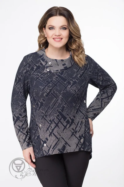 Туника женская полуприлегающего силуэта, с круглым вырезом горловины, с втачным отложным воротником фантазийной формы, с нагрудными вытачками, с декоративными планками в рельефных швах, отделкой которых служат пришивные пуговицы. Рукав цельнокроеный, длинный. Туника длиной до линии бедер, с асимметричным низом. Низ туники и рукавов обработан на подшивочной машине. Длина спинки 71-78 см Длина рукава 61-63 см