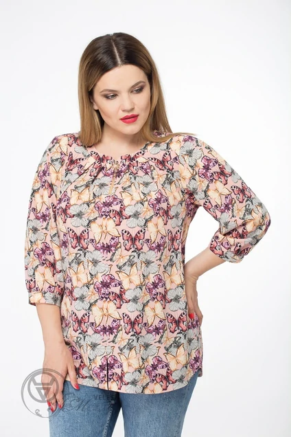 Туника женская свободного силуэта, с круглым вырезом горловины, обработанным бейкой, с декоративными складками, со средним швом, с разрезом по низу переда, с втачными одношовными рукавами ¾ со складками по окату и со сборкой по низу, с притачной манжетой с застёжкой на одну петлю и пуговицу. Туника длиной ниже линии бёдер, с закруглённым низом. Длина спинки 71-75 см, длина рукава 45-48 см
