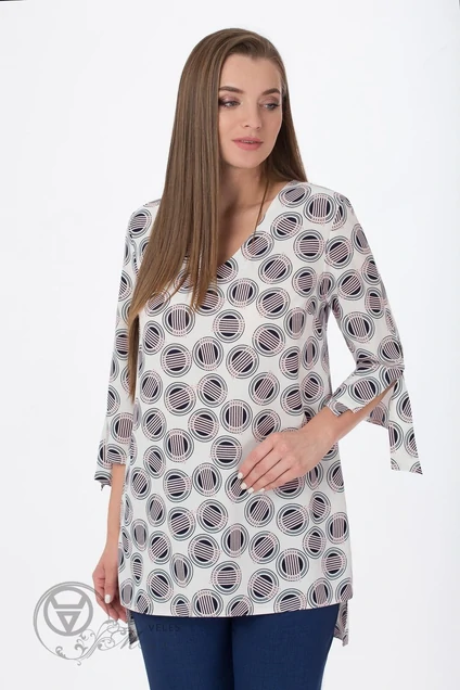 Туника женская свободного силуэта, с V-образным вырезом горловины, с втачным двухшовным рукавом длиной ¾ с разрезом в плечевом шве, с декоративными завязками, с нагрудными вытачками, с разрезами в боковых швах. Спинка со встречной складкой в горловине. Туника длиной до уровня бёдер, с удлинённой спинкой. По разрезам рукава, по низу туники проложены отделочные строчки ш.ш 0,2см. Длина спинки 78-82см Длина рукава 39-42см