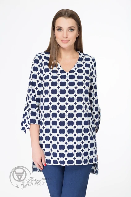 Туника женская свободного силуэта, с V-образным вырезом горловины, с втачным двухшовным рукавом длиной ¾ с разрезом в плечевом шве, с декоративными завязками, с нагрудными вытачками, с разрезами в боковых швах. Спинка со встречной складкой в горловине. Туника длиной до уровня бёдер, с удлинённой спинкой. По разрезам рукава, по низу туники проложены отделочные строчки ш.ш 0,2см. Длина спинки 78-82см Длина рукава 39-42см