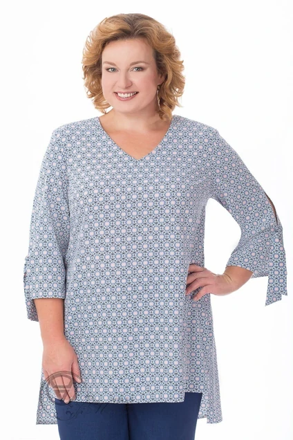 Туника женская свободного силуэта, с V-образным вырезом горловины, с втачным двухшовным рукавом длиной ¾ с разрезом в плечевом шве, с декоративными завязками, с нагрудными вытачками, с разрезами в боковых швах. Спинка со встречной складкой в горловине. Туника длиной до уровня бёдер, с удлинённой спинкой. По разрезам рукава, по низу туники проложены отделочные строчки ш.ш 0,2см. Длина спинки 78-82см Длина рукава 39-42см