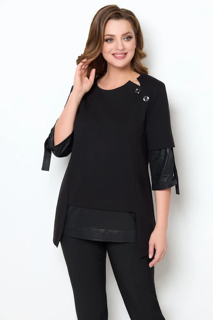 Туника женская полуприлегающего силуэта, с круглым вырезом горловины. На передней части полочки, с левой стороны кокетка с фигурным подрезом по горловине и имитацией застежки на пуговицы. С нагрудными вытачками по центральной части переда, идущими до боковой вставки. С укороченной центральной частью и притачной отделочной деталью из отделочной ткани. Рукав втачной, одношовный, длиной ¾, с притачной нижней частью из отделочной ткани. С декоративной патой, состоящей из двух частей застёгивающийся на пуговицу. Туника длиной ниже линии бедер.