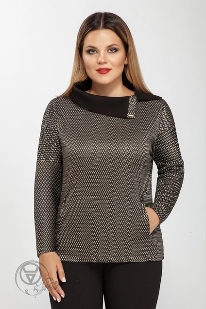 Туника женская свободного силуэта, со спущенным плечевым поясом, со стояче- отложным воротником из отделочного материала, с втачными рукавами. Туника длиной до уровня линии бёдер. Перед с рельефными швами от плечевого шва до низа. В рельефных швах обработаны карманы-кенгуру. Спинка с рельефными швами от плечевого шва до низа. Рукава втачные, одношовные, длинные. Воротник цельнокроеный, с отделочной планкой. Низ туники и рукавов подшит на подшивочной машине. Декоративным украшением туники служат пуговицы, пришитые на карманах и пришивная лейба на планке воротника. Длина спинки 61-65см Длина рукава 41см