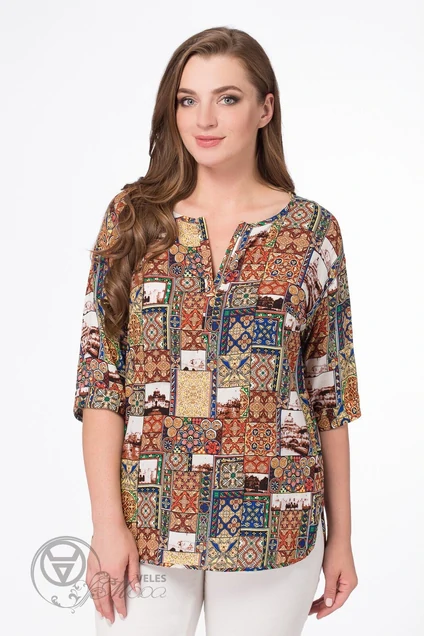 Туника женская свободного силуэта, с круглым вырезом горловины, окантованным косой бейкой, с планкой, с нагрудными вытачками. Рукава одношовные, длиной ¾, с притачной манжетой-подобраны патой. Туника с закругленным низом, длиной до линии бедер. Отделкой туники служат декоративные пуговицы, пришитые на планке и патах. Длина спинки 70-75 см, длина рукава 25-30 см
