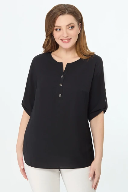 Туника женская свободного силуэта, с круглым вырезом горловины, окантованным косой бейкой, с планкой, с нагрудными вытачками. Рукава одношовные, длиной ¾, с притачной манжетой-подобраны патой. Туника с закругленным низом, длиной до линии бедер. Отделкой туники служат декоративные пуговицы, пришитые на планке и патах.
