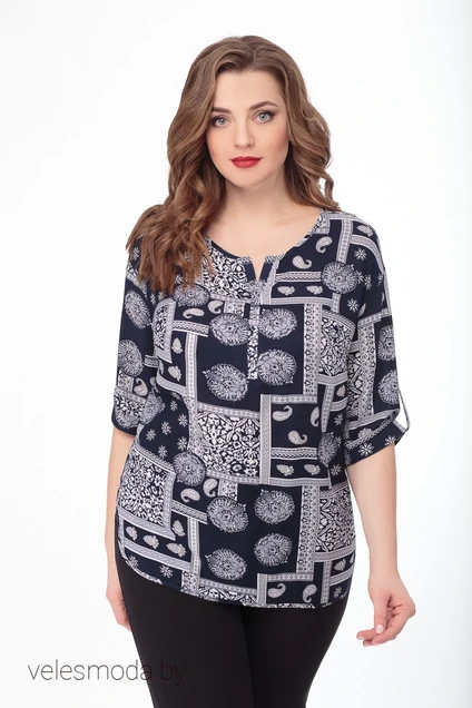 Туника женская свободного силуэта, с круглым вырезом горловины, окантованным косой бейкой, с планкой, с нагрудными вытачками. Рукава одношовные, длиной ¾, с притачной манжетой-подобраны патой. Туника с закругленным низом, длиной до линии бедер. Отделкой туники служат декоративные пуговицы, пришитые на планке и патах.