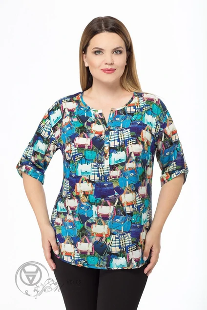 Туника женская свободного силуэта, с круглым вырезом горловины, окантованным косой бейкой, с планкой, с нагрудными вытачками. Рукава одношовные, длиной ¾, с притачной манжетой-подобраны патой. Туника с закругленным низом, длиной до линии бедер. Отделкой туники служат декоративные пуговицы, пришитые на планке и патах. Длина спинки 70-75 см, длина рукава 25-30 см