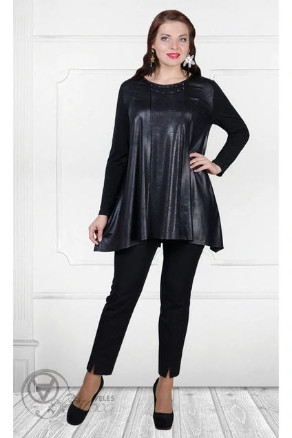 Модная туника, расклешенная к низу, из эластичного трикотажного полотна. Перед туники выполнен из трикотажного полотна под кожу и украшен декором из шнуров со стразами по горловине. Послужит отличным дополнением для гардероба любой женщины. Длина по спинке для 58 размера - 78 см.