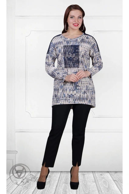 Туника прямого силуэта из трикотажного полотна с дизайном. Перед украшен аппликацией из страз. Это прекрасный вариант для офиса и на каждый день.