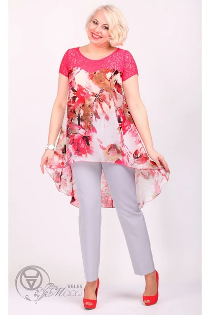 Очаровательная туника А-силуэта из нежного шифона с дизайном. Рукава и кокетка – из кружева. Чудесная модель для тех, кто любит носить брючки.