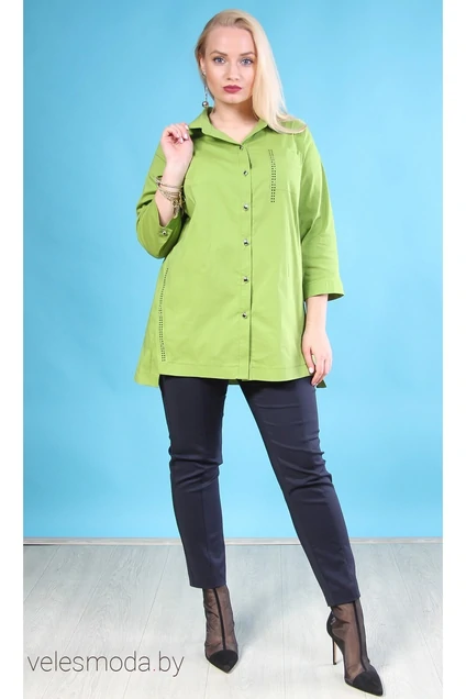 Туника прямого силуэта из хлопчатобумажной ткани - это прекрасный вариант на каждый день. Стразы, которыми украшены боковые разрезы и накладной карман, создают стройнящий эффект и делают ее нарядной. У туники отложной воротничок со стойкой, втачные рукава длиной три четверти с манжетами, застежка на пуговицы. Модель прекрасно сочетается с зауженными брючками и покоряет ярким цветом свежей зелени.