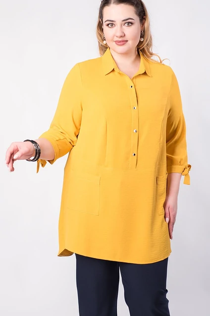 Солнечная туника А-силуэта от Camelia радует глаз и помогает подчеркнуть все достоинства пышной фигуры. Втачные рукава украшены манжетами с завязками. Воротник на стойке добавляет строгость и стиль. Притачная планка до подреза по линии талии застёгивается на маленькие контрастные пуговки, которые создают игривый нюанс и завершают образ. Накладные карманы позволят иметь всегда под рукой ключи, бэджи или карты. Складка по спинке обеспечивает свободу движения. Средняя длина туники по спинке 89 см. Средняя длина рукава 53 см. Рост модели на фото 169 см.