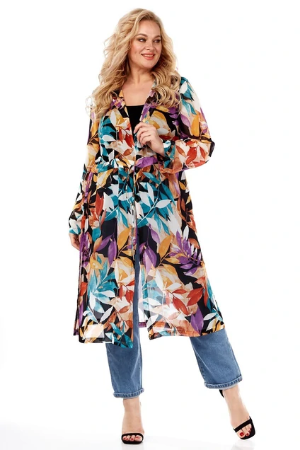 Длина изделия по спинке 110 см, длина рукава 62 см. Тип ткани: шифон. Модель до 82 размера