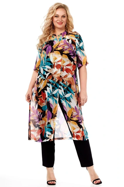 Длина изделия по спинке 110 см, длина рукава 35 см. Тип ткани: шифон. Модель до 82 размера