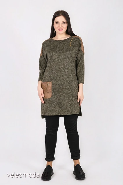 Женская туника полуприлегающего силуэта выполнена из мягкого и уютного трикотажного полотна с добавлением отделочной ткани “под кожу” на фигурных кокетках, расположенных по плечевым швам, и кармане.