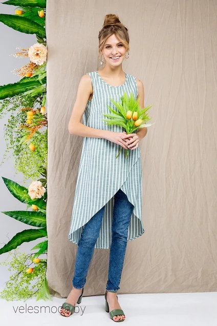 Туника прямого силуэта из хлопка в полоску. Перед с нагрудными вытачками, с фигурной линией низа на запах и удлиненной спинкой. Горловина округлой формы.