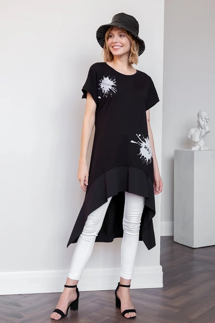 Туника с разной длиной переда и спинки. По переду - средний шов и 2 печати. Низ переда обработан широкой отрезной деталью. Вырез горловины обработан бейкой. Пройма спущена, рукав короткий, втачной. На спинке изделия - печать. Длина спинки - миди, низ детали спинки обработан отрезной деталью.