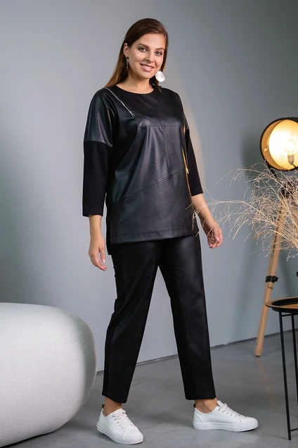 Туника из экокожи и трикотажа свободного силуэта. Вырез горловины округлый, по переду - средний шов, отрезная талия. На линии плеча застежка-планка с кнопками, на втором плече - декоративная молния. В изделии есть карманы на молнии. Рукав цельнокроеный, укороченный, с трикотажной вставкой. Спинка изделия из трикотажа, с кокеткой из экокожи. Разрезы в боковых швах.