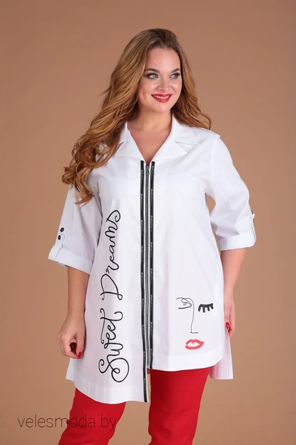 Ультрамодная туника-рубашка оверсайз из хлопковой ткани свободного А-силуэта,с ассиметричной линией низа. Спереди выполнена застежка на декоративную металлическую молнию с отделочной тесьмой, в боковых швах расположены внутренние карманы, по полочкам нанесена декоративная печать. Вырез горловины V-образный с отложным воротником и лацканами. Спинка прямая с притачной кокеткой вверху. Линия плеча слегка приспущена, рукав рубашечный, свободный, длиной 46 см, внизу рукава - пата с застежкой на петлю-пуговицы(длину рукава можно регулировать). Разный уровень длины по переду и разрез с правой стороны- придают изделию определённый шик и стиль. Модель прекрасно подойдёт к любым брюкам, джинсам, легинсам , как узкого силуэта, так и свободного. Выбирайте модели брюк нашего бренда и Вы неповторимы!