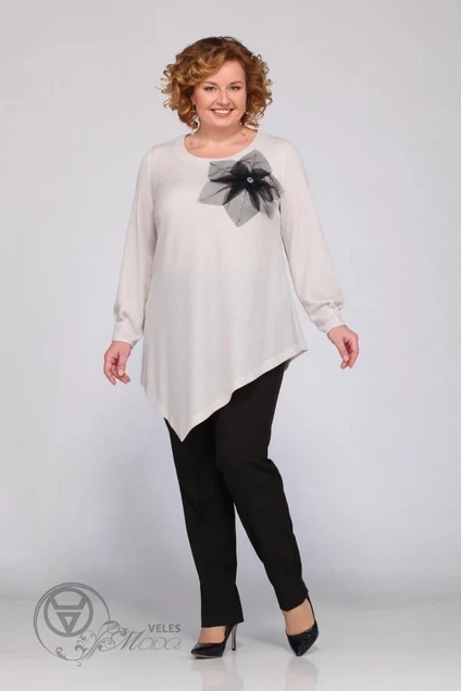 Блуза женская силуэта трапеция с фигурным низом. Вырез горловины круглый. Рукав втачной одношовный. По низу рукава складки. По переду бант из сетки. размеры 56 58 60 длина изд. по спинке 88,0 88,0 88,0 ширина спинки 40,0 40,0 40,0 В заст. виде на уровне глубины пройм 55,0 57,0 59,0 в заст. виде ширина изд. по линии талии 57,0 59,0 61,0 ширина изделия на уровне линии бёдер 62,0 64,0 66,0 ширина изделия внизу ширина рукава на уровне глубины проймы 19,0 20, 21,0 длина рукава 58,0 58,0 58,0 ширина плеча 9,5 9,5 9,5 ширина рукава внизу 11,0 11,0 11,0