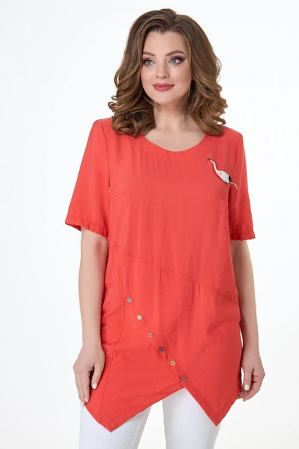 Туника свободного силуэта с фигурным низом. Рукав втачной короткий. Вырез горловины круглый. Туника с подплечниками. По переду декоративные пуговицы. Спинка со средним швом. Изделие без застежек. В комплекте брошь. Длина по спинке: 75 см. Длина рукава: 29 см.