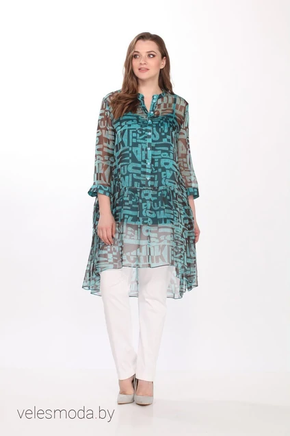 Комплект женский, состоящий из топа и накидки. Топ полуприлегающего силуэта из однотонной ткани. Горловина и пройма окантованы. По переду нагрудные выточки Накидка выполнена из сетки с дизайном, свободного кроя, по переду проходят рельефы от плеча. Центральная часть переда двойная со сборкой двойная со сборкой плечевому шву. Воротник-стойка цельнокроеная. Рукав одношевный в тачной, ¾ длины Накидка со съемным поясом из основной ткани Материал не скатывается и не линяет. Туника: длина 107, рукав 45. Топ: на брителях, длина 57.
