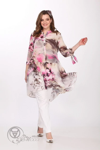 Комплект двупредметны , нарядный ; состоит из туники , топа . Туника свободного силуэта , длиной ниже линии бедер с фигурным низом ,из текстильной плательно-блузочной ткани .Перед с планкой на застежку, прорезные петли , пришивные пуговицы. Вырез горловины обработан воротником стойкой . Рукав втачной одношовный ,3/4 , по низу обработан манжетой с завязкой на бант .По низу туники настрачной волан . Топ из трикотажной ткани без рукавов , длиной до линии бедер . Длина 107, рукав 45. В комплекте топ на брителях, длина 57.