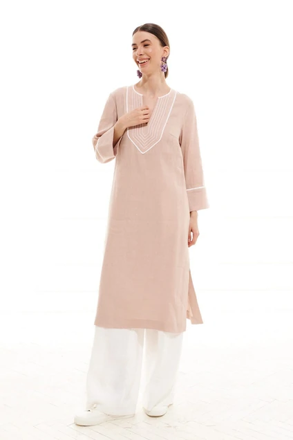 Туника женская, прямого силуэта, длиной ниже линии колен из плательно-блузочной ткани. Перед с нагрудными вытачками и декоративной вставкой - подрезом с контрастной вышивкой и кантом. Вырез горловины круглый с углубленным фигурным разрезом спереди. Рукав одношовный, втачной, три четверти, с широкой притачной манжетой и кантом. В боковых швах разрезы. Длина 117 см, рукав 50 см.