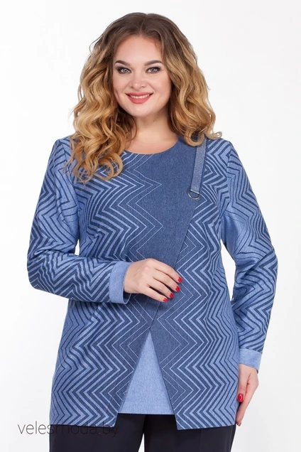 Блузка прямого силуэта из трикотажного полотна. Полочка разрезная по диагонали с вытачками из бокового шва. Горловина округлая, обработана обтачкой. Рукав втачной одношовшый на манжете. По переду от плеча настрочена декоративная тесьма с металлическим полукольцом. Низ изделия фигурный. Длина по спинке 74 см. Длина рукава 62 см.