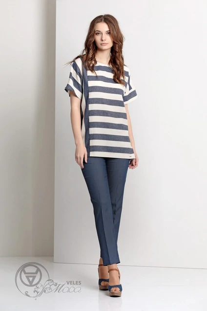 Туника выполнена из хлопчатобумажной ткани в полоску, свободного кроя, без застежки, разрез в боковом шве с одной стороны. Длина туники р.42-46 - 65см, р.48-52 - 70см. Длина рукава от горловины р.42-46 - 31 см, р.48-52 - 34 см.