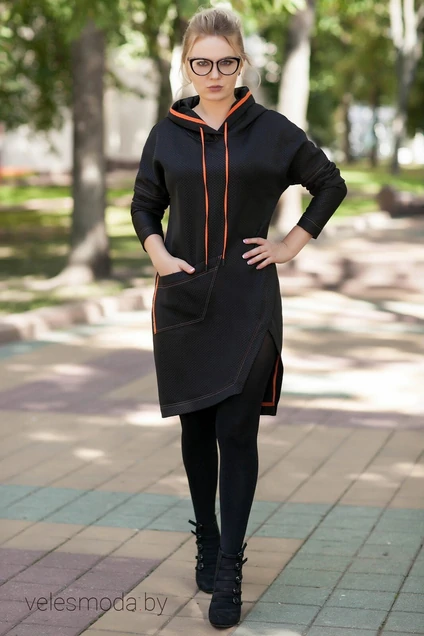 Туника женская выполнена из трикотажного полотна, свободного силуэта с ассиметричной полочкой. Перед изделия декорирован ассиметричным функциональным накладным карманом выделенным лентой и цветной отсрочкой по швам. В горловину вставлен капюшон. Рукав длинный приспущенный. спинка изделия разрезная отстроченная гарусной нитью. Внутренние швы изделия частично декорированы отделочной хлопковой лентой.