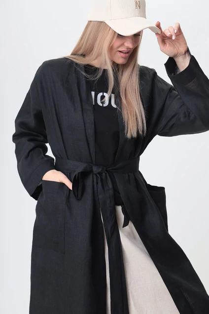 Туника женская из льна. Туника прямого силуэта, свободной формы, с длинным рукавом , боковыми карманами, без застежки ,завязывается на пояс. Рукава длинные рубашечного кроя со спущенным плечом. По низу рукавов широкая подгибка. Боковые накладные карманы. Туника с высокими боковыми разрезами. Борт, низ, горловина спинки обработаны широкой планкой.
