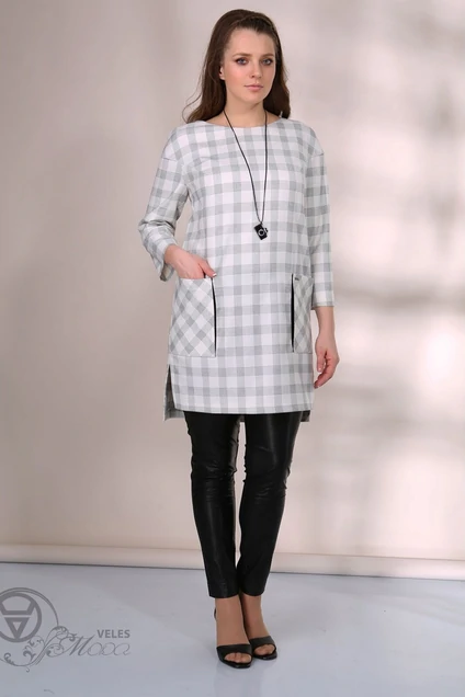 Уютная стильная туника из мягкой теплой ткани в клетку – прекрасный компаньон к брюкам модели 16186 из нашей коллекции. Туника без воротника, с круглым вырезом горловины, без застежки. По переду с нагрудными вытачками, накладными карманами. Спинка со средним швом, односторонней складкой и декоративной молнией, расположенной посередине детали от верха до низа. По боковым швам разрезы. По переду и спинке с перепадом длины. Длина изделия: 87 см, Длина рукава: 43 см